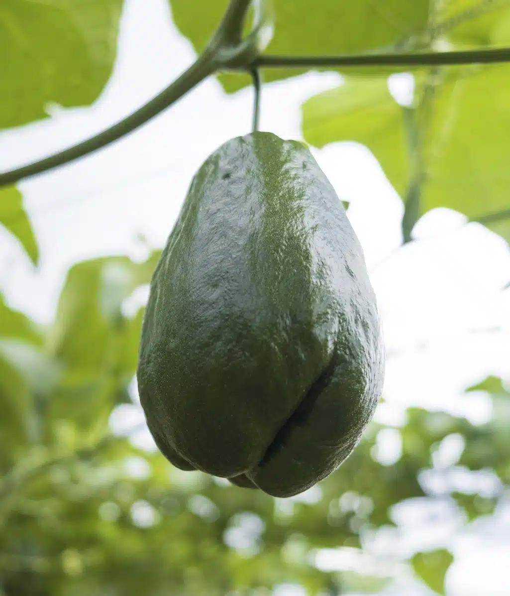 El chayote negro tiene una corteza firme y se caracteriza por su color brillante verde oscuro, su corteza es suave y comestible. Debajo de la cáscara, la pulpa de color verde pálido es crujiente, almidonada, húmeda y tierna. También hay un núcleo central que contiene una pequeña semilla de color crema.